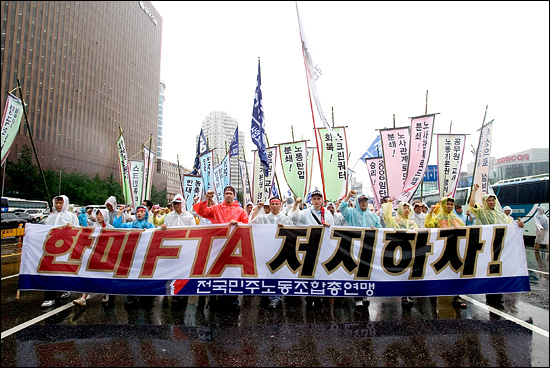 2006년 7월 서울역에서 FTA저지 집회를 마친 노동자들이 2차 범국민대회를 위해 시청앞으로 행진하고 있다. |